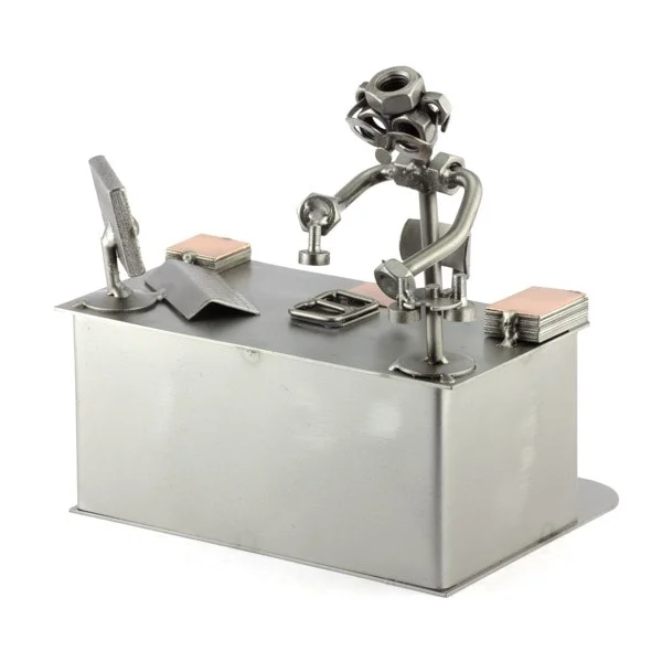 De metalen bouten en moeren beeldjes, ook wel moerenmannetjes genoemd, zijn gemaakt in originele Steelman24 kwaliteit, uitvoerig en zorgvuldig handgemaakt. Als gevolg van deze afwerking is elk afzonderlijk metalenbeeldje uniek en voldoet aan de hoogste kwaliteitsnormen. Hierdoor kunnen de beeldjes soms iets afwijken van de productfoto. Deze kleine stukjes van kunst die bestaan uit schroeven, moeren, bouten, metaal en koper worden geproduceerd met een hoog niveau van vakmanschap en een oog voor detail, in een intensief en ingewikkeld productieproces. Op hetzelfde moment zijn ze niet alleen gekenmerkt door hun buitengewone creativiteit, maar ook door unieke aandacht voor detail.