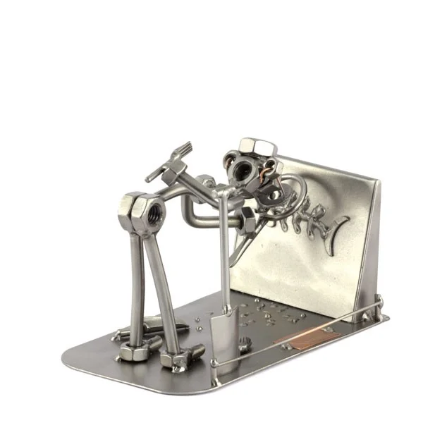 De metalen bouten en moeren beeldjes, ook wel moerenmannetjes genoemd, zijn gemaakt in originele Steelman24 kwaliteit, uitvoerig en zorgvuldig handgemaakt. Als gevolg van deze afwerking is elk afzonderlijk metalenbeeldje uniek en voldoet aan de hoogste kwaliteitsnormen. Hierdoor kunnen de beeldjes soms iets afwijken van de productfoto. Deze kleine stukjes van kunst die bestaan uit schroeven, moeren, bouten, metaal en koper worden geproduceerd met een hoog niveau van vakmanschap en een oog voor detail, in een intensief en ingewikkeld productieproces. Op hetzelfde moment zijn ze niet alleen gekenmerkt door hun buitengewone creativiteit, maar ook door unieke aandacht voor detail.