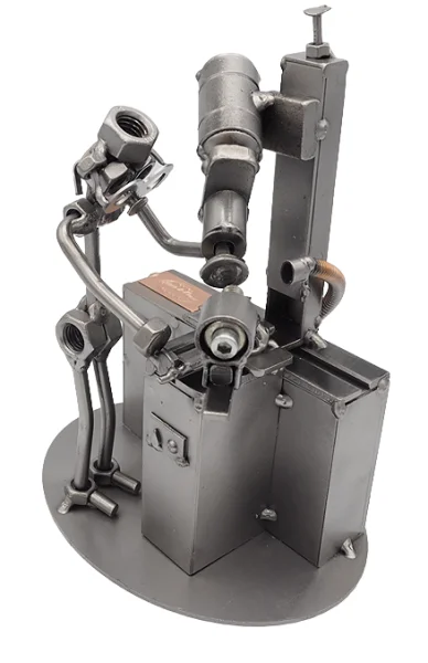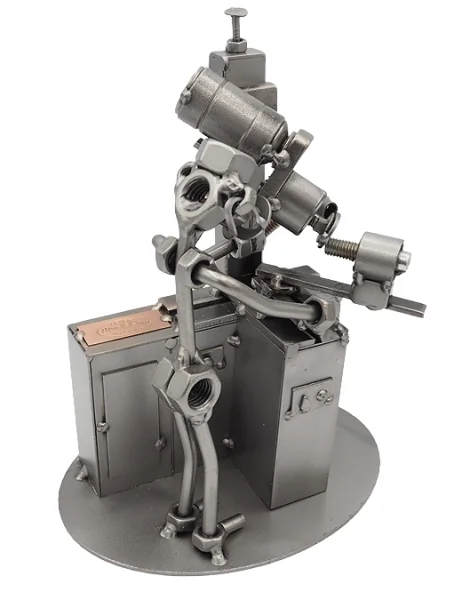 Onze metalen bouten en moeren beeldjes, ook wel moerenmannetjes genoemd, zijn vervaardigd in originele Steelman24-kwaliteit. Elk beeldje is uitvoerig en zorgvuldig met de hand gemaakt, wat betekent dat elk exemplaar uniek is en voldoet aan de hoogste kwaliteitsnormen. Door het intensieve productieproces kan het voorkomen dat de beeldjes iets afwijken van de productfoto’s, maar dit draagt bij aan hun unieke karakter. Deze kleine kunstwerken, gemaakt van schroeven, moeren, bouten, metaal en koper, zijn een prachtig voorbeeld van vakmanschap met een scherp oog voor detail.