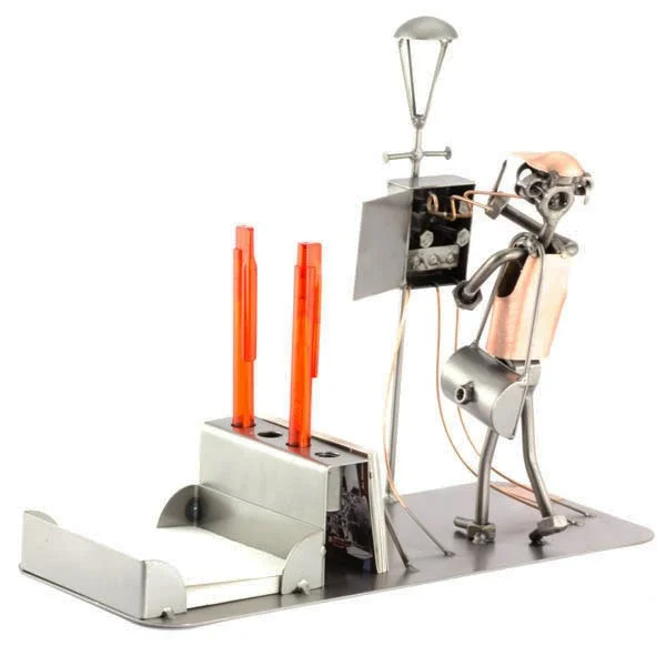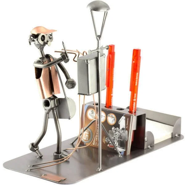 Electricien met papierbak / pennenstandaard en visitekaarthouder. Deze mooie beroepenbeeldjes zullen zeker mooi staan, waar u ze ook neer zet. De ontvanger zal dit cadeau zeker waarderen.