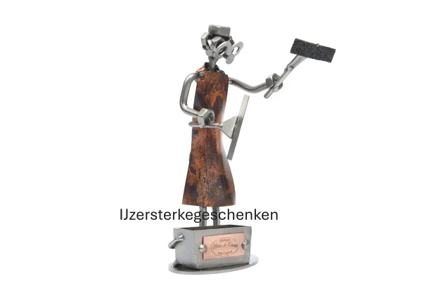 De glazenwasser van het glasbewassingsbedrijf maakt de ramen weer streeploos schoon. Dit handgemaakte metalen beeldje is een vrolijk en origineel cadeau voor elke glazenwasser of schoonmaakspecialist. Of het nu gaat om een professionele relatie, collega of vriend – dit beeldje zorgt gegarandeerd voor een glimlach.