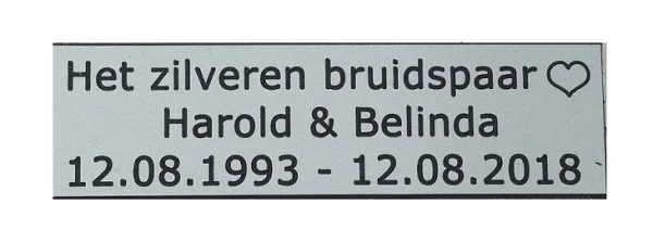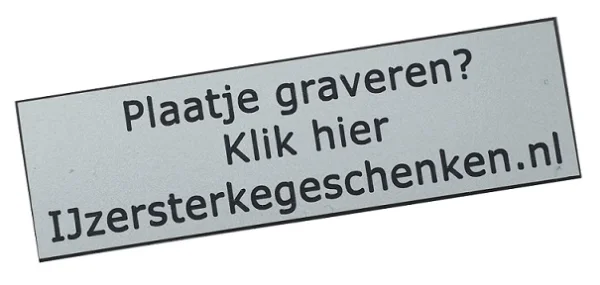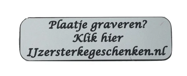 Het is op de meeste beeldjes mogelijk om een zelfklevend graveerbaar plaatje te plakken. De plaatjes zijn van bij passende kleur kunststof gemaakt. De gegraveerde plaatjes zijn afhankelijk van de hoeveelheid tekst ongeveer 5 cm lang en 1,5 cm hoog. U kunt bij het afronden van het bestelproces in de commentaarbalk aangeven wat er op het plaatje moet komen te staan.