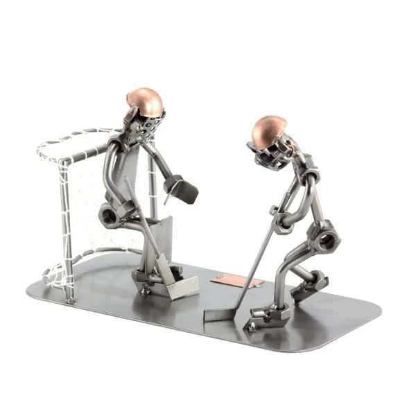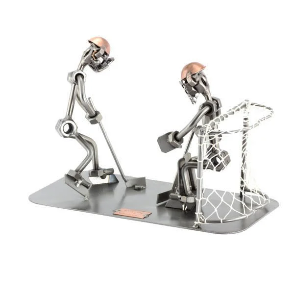 De speler probeert de puk in het doel te schieten maar de keeper staat in de weg. Deze mooie sportbeeldjes zullen zeker mooi staan, waar u ze ook neer zet.