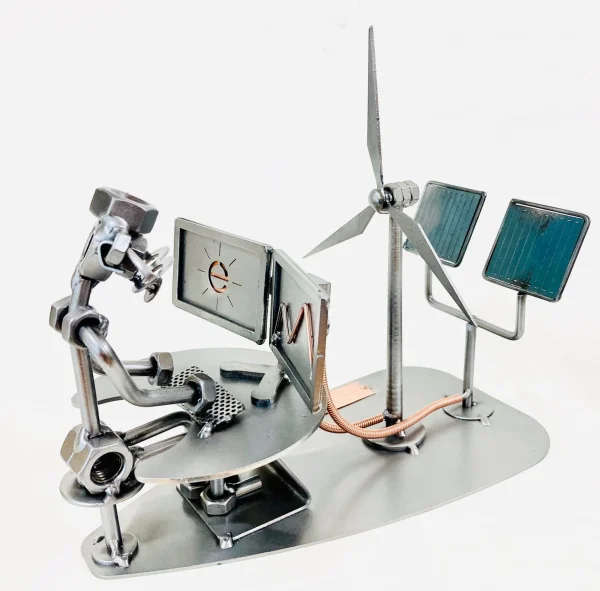 Het beeldje toont een ingenieur in actie, omringd door technische symbolen van groene energie. Denk aan windturbines, zonnepanelen of een technisch planbord met grafieken. Alles is met uiterste precisie vormgegeven uit metalen onderdelen zoals moeren, bouten en draadstaal.