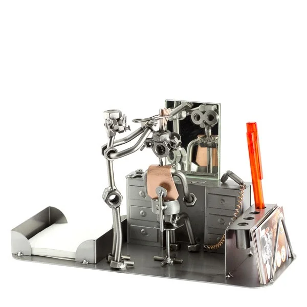 De kapper knipt het haar van zijn klant weer kundig. De klant bekijkt zijn nieuwe kapsel in de spiegel. De bureauset bevat een papierbakje, pennenhouders en een visitekaarthouder. Deze mooie beroepenbeeldjes zullen zeker mooi staan, waar u ze ook neer zet. De ontvanger zal dit cadeau zeker waarderen.