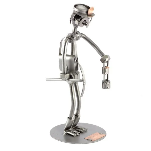 De metalen bouten en moeren beeldjes, ook wel moerenmannetjes genoemd, zijn gemaakt in originele Steelman24 kwaliteit, uitvoerig en zorgvuldig handgemaakt. Als gevolg van deze afwerking is elk afzonderlijk metalenbeeldje uniek en voldoet aan de hoogste kwaliteitsnormen. Hierdoor kunnen de beeldjes soms iets afwijken van de productfoto. Deze kleine stukjes van kunst die bestaan uit schroeven, moeren, bouten, metaal en koper worden geproduceerd met een hoog niveau van vakmanschap en een oog voor detail, in een intensief en ingewikkeld productieproces. Op hetzelfde moment zijn ze niet alleen gekenmerkt door hun buitengewone creativiteit, maar ook door unieke aandacht voor detail.Er zijn geen grenzen aan ideeën en creativiteit in de ontwikkeling van de beeldjes en objecten. Meer dan 500 verschillende creaties uit alle gebieden van het leven hebben geleid tot het maken van deze prachtige moerenmannetjes. Kan je geen cadeautje vinden? Zoek niet verder, deze unieke en originele geschenken zijn een geweldig cadeau idee - of voor een verjaardagscadeau, diploma, diplomering, geslaagd, school, universiteit, stage, kompel, mijnbouw, goudmijn, kolenmijn, pensionering, vaderdag cadeau, moederdag cadeau, relatiegeschenk, cadeautjes, afstudeercadeau, opening nieuwe zaak, sportprijs, bergbeklimmer, afscheidscadeau, 12,5 jaar in dienst, 25 jaar in dienst, 40 jaar in dienst, persoonlijke tekst op het plaatje, behalen van diploma, jubileum cadeau, cadeau voor hem, cadeau voor je vriend, cadeau idee, kado voor hem, als een bewijs van liefde of als geschenk voor uw host - simpel gezegd, boutenbeeldjes voor bijna elke gelegenheid.