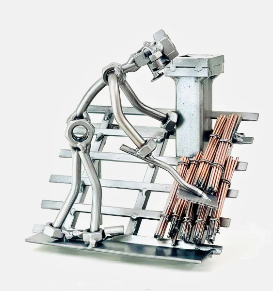 Dit ontwerp is niet alleen decoratief, maar vertelt een verhaal. Het beeldt een moment uit dat voor buitenstaanders misschien alledaags lijkt, maar voor de vakman herkenbaar en betekenisvol is. Een moment van rust, vakwerk en concentratie, gegoten in staal en koper.