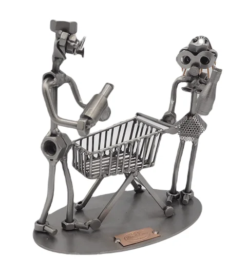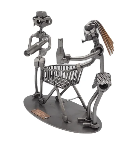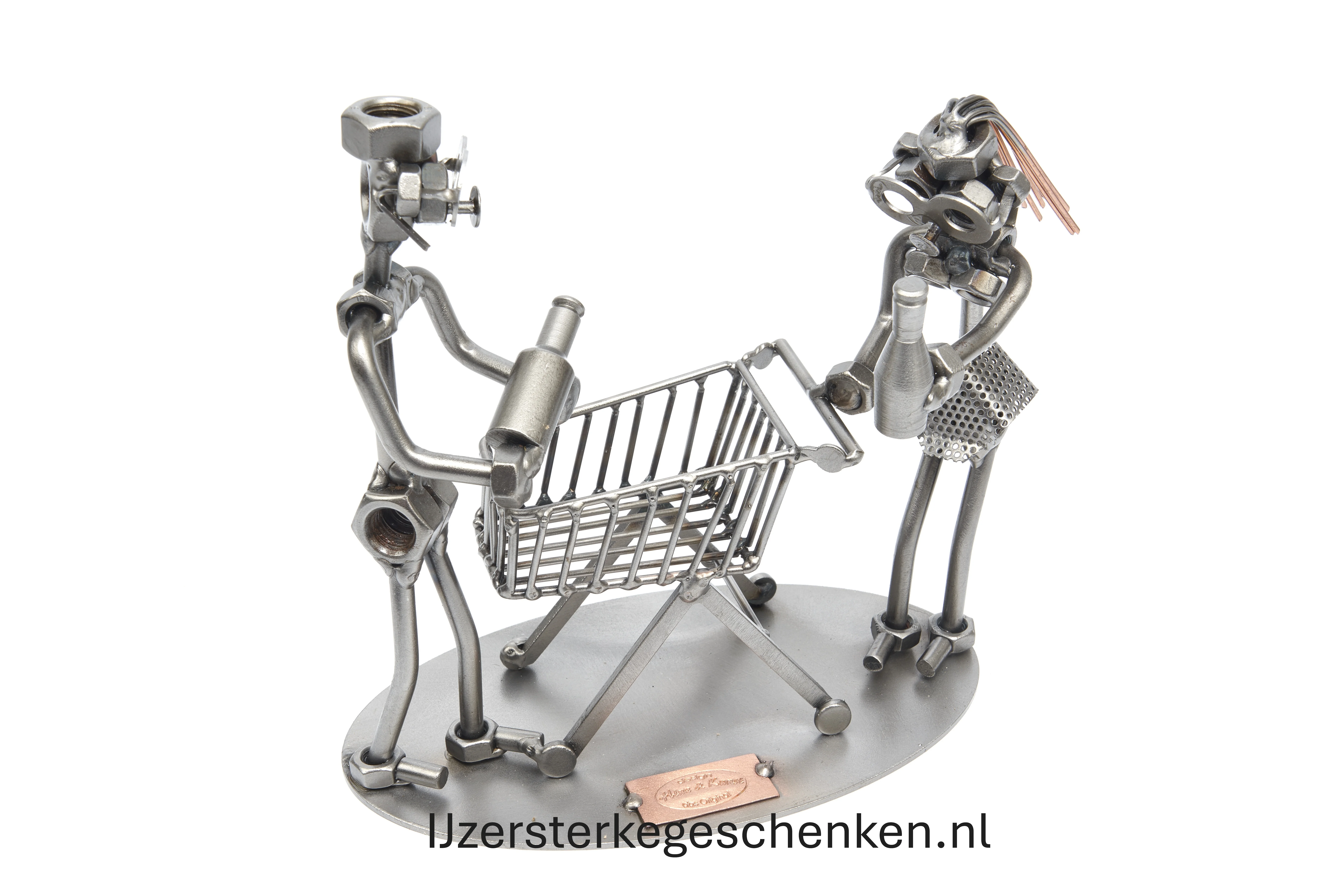 Dit handgemaakte metalen tafereel van de slijterij medewerker vangt op speelse wijze het werk en de sfeer van een slijterij of supermarkt. Een winkelwagentje wordt gevuld met een fles, terwijl een tweede figuur toekijkt met een vrolijke blik. Of je dit nu ziet als een moment uit een drankenwinkel, supermarkt of gewoon een humoristische scène van een stel op pad voor wijn, het roept direct herkenning op. Het metalen figuur vertelt een verhaal dat menig kijker aan het lachen maakt en tegelijk een compliment is voor de professional in de retail.