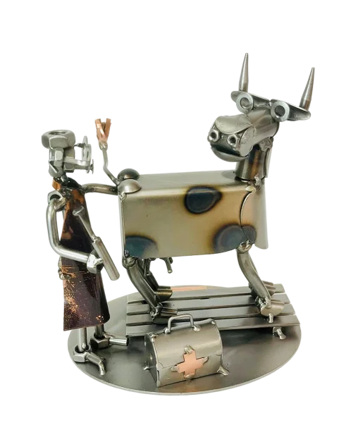 Dit unieke beeldje van moeren en bouten is een bijzonder cadeau voor een veearts-KI inseminator, een dierenarts die zich inzet voor de gezondheid en het welzijn van vee. Met een afmeting van 16x13x18 cm is het beeldje perfect geschikt om een plekje te krijgen op een bureau, in de praktijkruimte of zelfs thuis. De combinatie van metaal en vakmanschap maakt het beeldje niet alleen een mooie decoratie, maar ook een symbolische herinnering aan het werk van een dierenarts die zich dagelijks bezighoudt met de zorg voor fokvee, opfok en de voortplanting van dieren. Het beeldje is met zorg en precisie vervaardigd en toont op een grappige manier de essentie van het vak van een veearts.