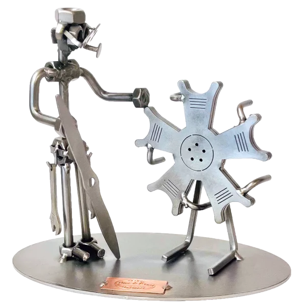 Een vliegtuigmonteur speelt een essentiële rol in de luchtvaartindustrie, verantwoordelijk voor het onderhoud en de reparatie van vliegtuigen om ervoor te zorgen dat deze veilig en betrouwbaar de lucht in kunnen. Dit beeldje, gemaakt van moeren en bouten, is een perfect en uniek cadeau voor iedereen die werkzaam is in de luchtvaart. Het symboliseert niet alleen de technische vaardigheden, maar ook de creativiteit en precisie die nodig zijn om vliegtuigen te onderhouden en te repareren.