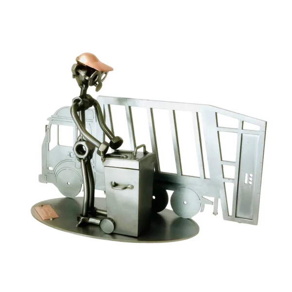 De uitgesneden vuilniswagen in de achtergrond geeft het geheel diepte en maakt het niet alleen een decoratief object, maar een echt kunstwerkje. Het stevige metalen voetstuk zorgt ervoor dat het beeld stabiel staat, of het nu op een bureau, plank of vitrinekast geplaatst wordt.