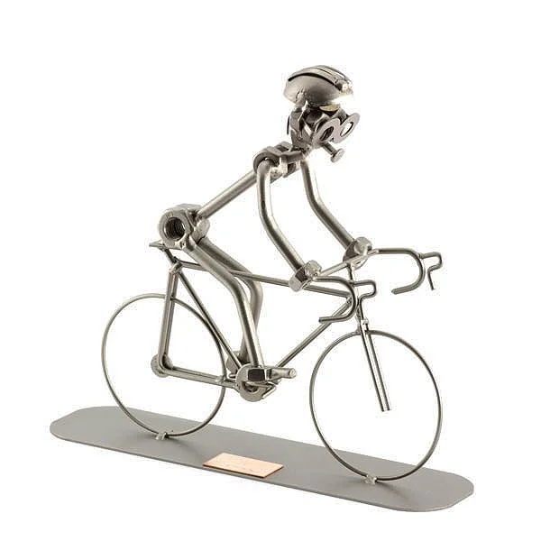 Dit handgemaakte metalen beeldje van een wielrenner op zijn racefiets is een prachtig cadeau voor iedere wielerliefhebber en sportenthousiasteling. Het beeldje is vervaardigd uit schroeven, moeren en bouten, wat het een unieke uitstraling geeft en een echte blikvanger maakt voor iedere kamer of werkruimte. Met een afmeting van 17x17x5 cm en een gewicht van 0,36 kg is het een compact kunstwerk dat past in elk interieur.