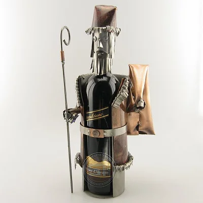Wijnfleshouder sinterklaas met staf en zak vol cadeaus.